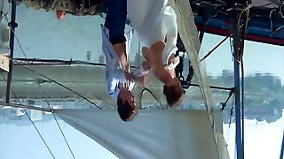Hot blonde beauty kisses a handsome stud on the boat