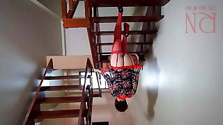 Cute Milf in red stockings without panties shows pussy and ass. Red corset, stocking with garters.